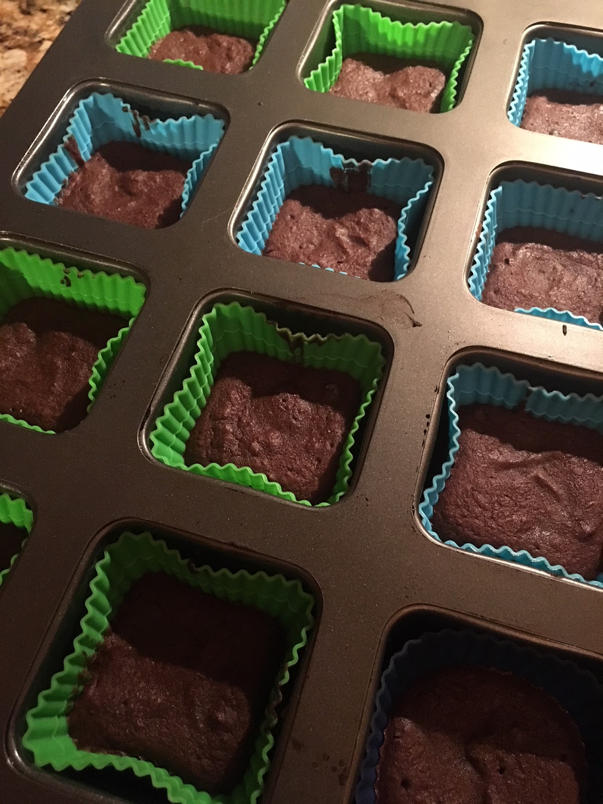 *I used my silicone squares and my mini brownie pan instead of 9x9 inch baking pan. I then distributed the batter evenly into 16 tiny squares. If you use this method, baking time is about 22-25 minutes.